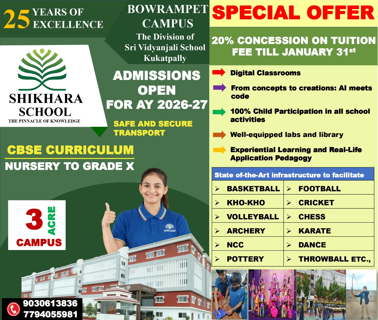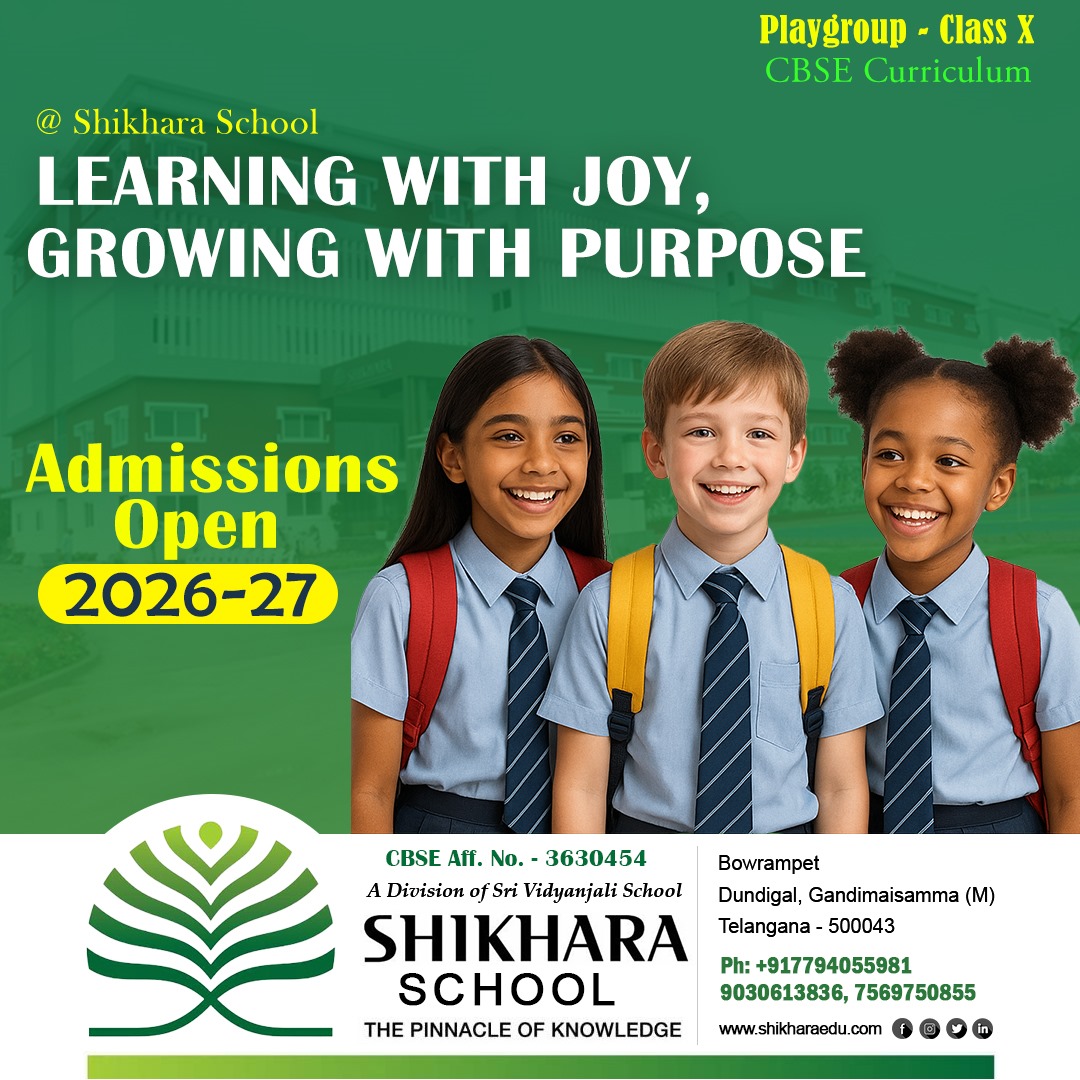 Shikhara – the Pinnacle of Knowledge, carries forward the rich legacy of Sri Vidyanjali School in Kukatpally. It is conceived with the need for quality education, in bringing up children of character and the citizens of responsible disposition.